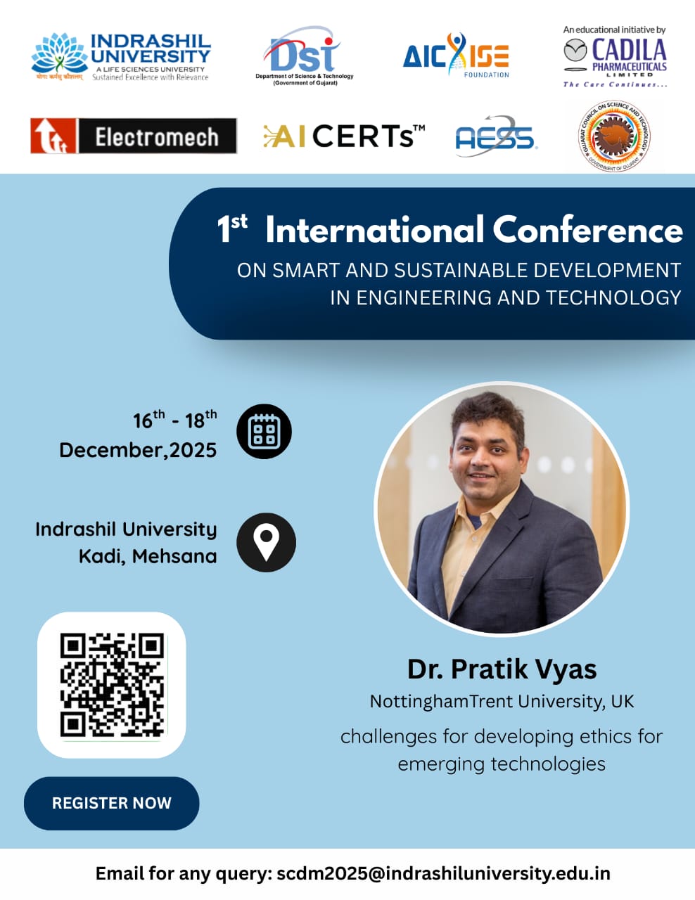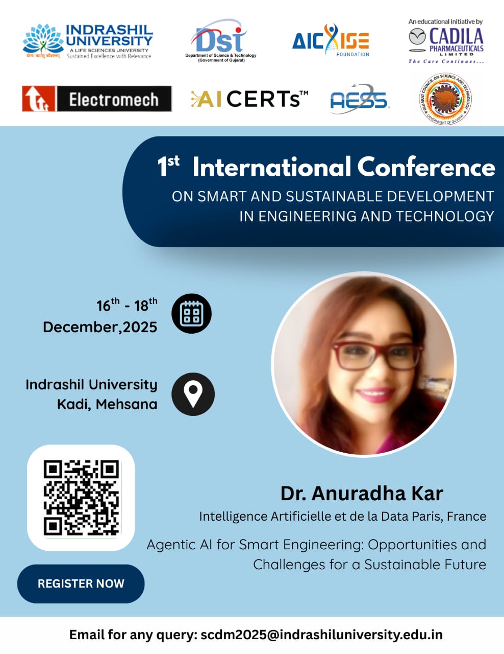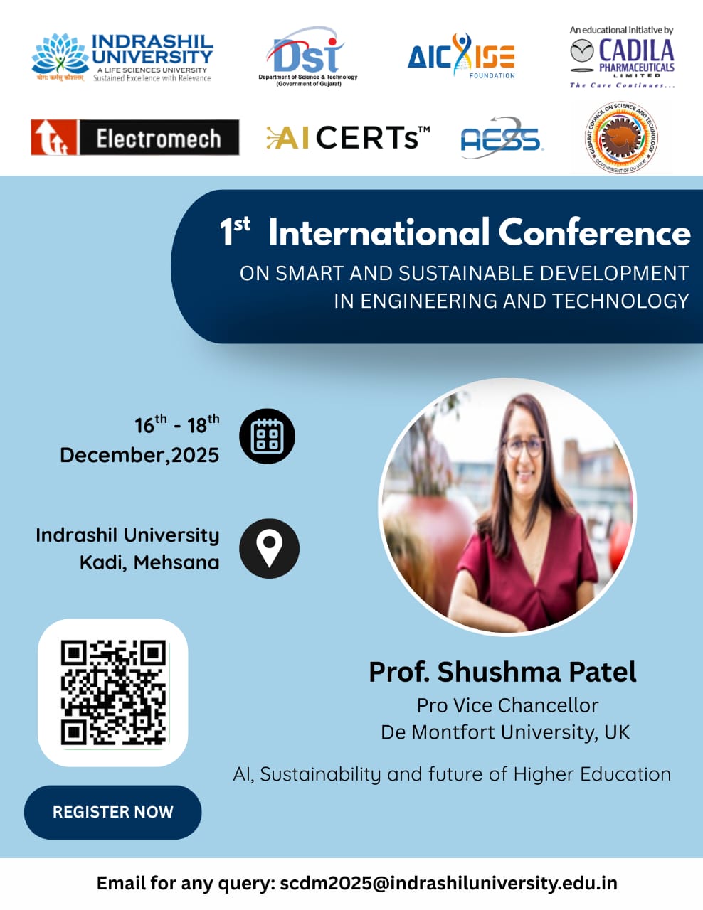 The International Conference on Smart and Sustainable Development in Engineering and Technology, organized by Indrashil University, aims to bring together global experts, industry leaders, academicians, and researchers to explore innovations that drive sustainable growth across diverse fields of science and technology.